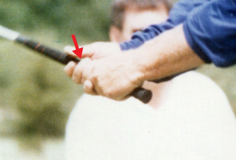 Check out this picture where Moe is holding the club in his lead hand. Notice where the club is placed in the heel pad as he begins to extend his arm. This picture shows Moe’s routine as he starts to put his arms behind the ball.