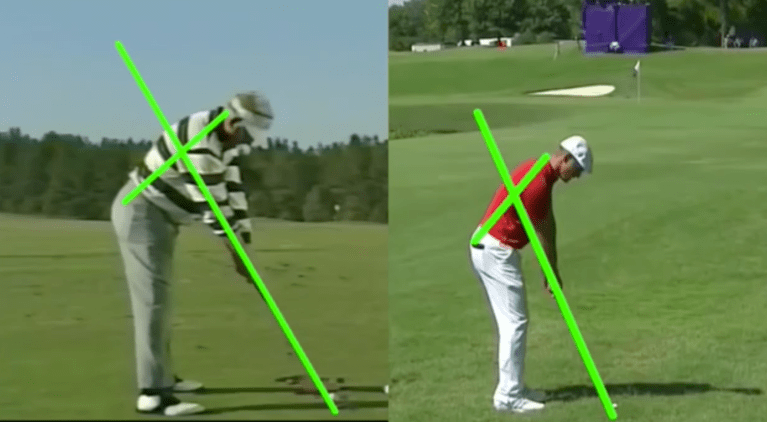 At address, Bryson has less secondary spine angle, side-bend, than Moe. This leads to straightening the lead leg, a lifting of the body and an over-rotation of the torso through impact.